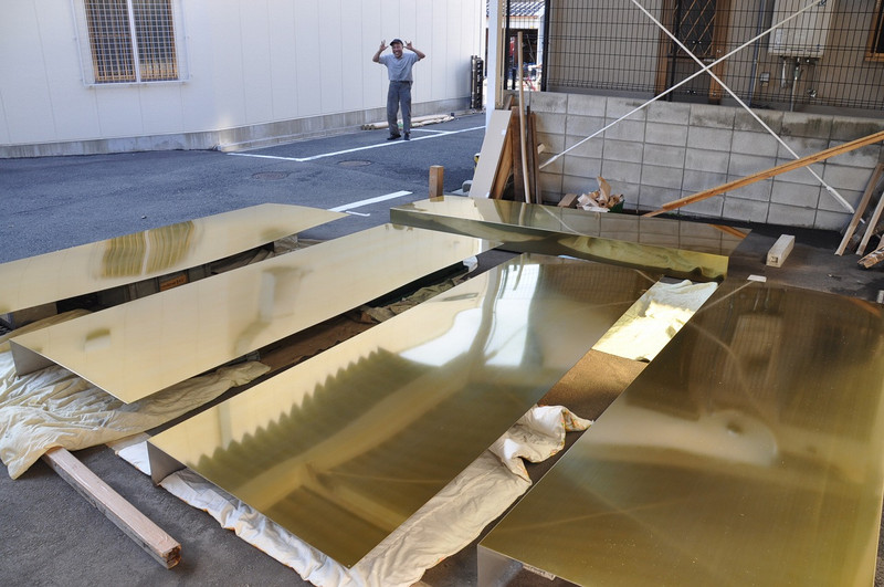 2012.09.26 カラークリヤ ゴールド ホテルの壁面パネルをカラークリアのゴールドで仕上げました! 母材:ステンレス #400 仕上げ:アクリル焼付 写真の選んでたら中央の上にある人物が… おい、オヤジ!ちょけすぎやろ!!