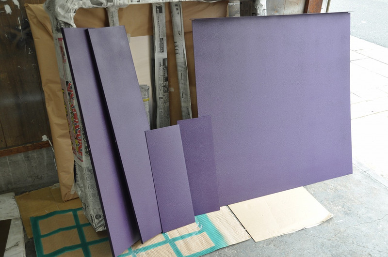 什器のパネルをチヂミ塗装のパープルで仕上げました!